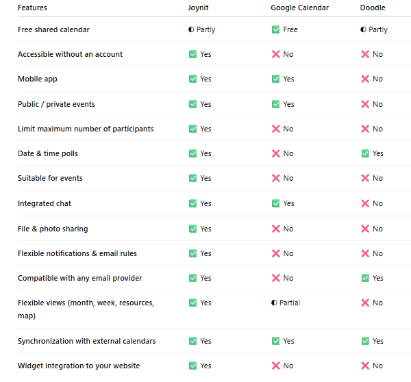 By contrast, Joynit was designed from the start as a shared calendar for nonprofit communities of all sizes, from small teams of 5 people to large organizations coordinating hundreds or even thousands of volunteers. Calendars can be shared via a simple link, without requiring users to create an account, making onboarding fast and frictionless.